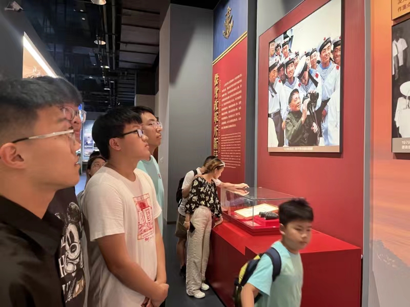 駐足在正門廣場的紀念碑前,隊員們通過碑文了解到人民海軍自1949年4月23日華東軍區(qū)海軍成立以來的重要歷史時刻,初步認識了海軍的發(fā)展脈絡。進入總序廳,名為《人民海軍忠于黨》的大型圓雕引人注目,接著實踐隊員先后參觀了社會主義革命和建設時期 、改革開放和社會主義現(xiàn)代化建設新時期和中國特色社會主義新時代三個時期的四大展廳。展廳里內涵厚重的雕塑、浮雕、場景、油畫以及數(shù)量眾多的視頻等,全方位、全過程、全景式給實踐隊員展現(xiàn)了人民海軍在中國共產黨的堅強領導下,取得舉世矚目偉大成就的奮斗史、發(fā)展史。