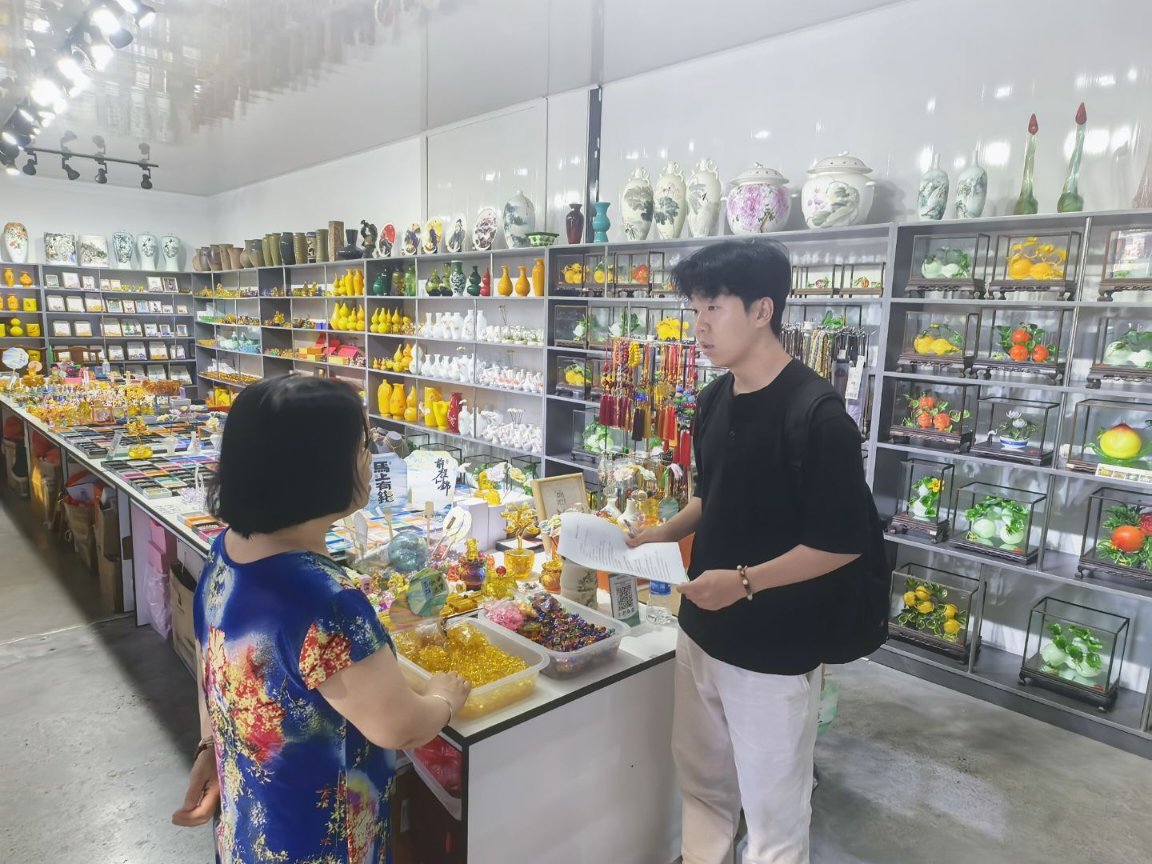 下午,實(shí)踐隊(duì)來到博山琉璃大觀園。這里琳瑯滿目的琉璃制品讓人目不暇接,從精致的擺件到實(shí)用的器皿,琉璃商品種類繁多。隊(duì)員們一邊欣賞著這些琉璃制品,一邊對(duì)其價(jià)格進(jìn)行調(diào)查,并向商戶和顧客發(fā)放調(diào)查問卷,了解市場對(duì)琉璃制品的需求和反饋。