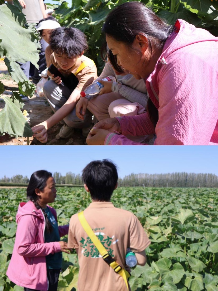 從實驗室到田間地頭,成員們實地考察南瓜、向日葵、玉米等作物試驗基地。實踐團成員劉海濤蹲在試驗田采集土壤樣本,為研究積累第一手資料;在水肥一體化設(shè)備區(qū),實踐團與科研人員深入探討技術(shù)優(yōu)化方案,確保成果適配當(dāng)?shù)赝寥捞匦院妥魑镄枨?