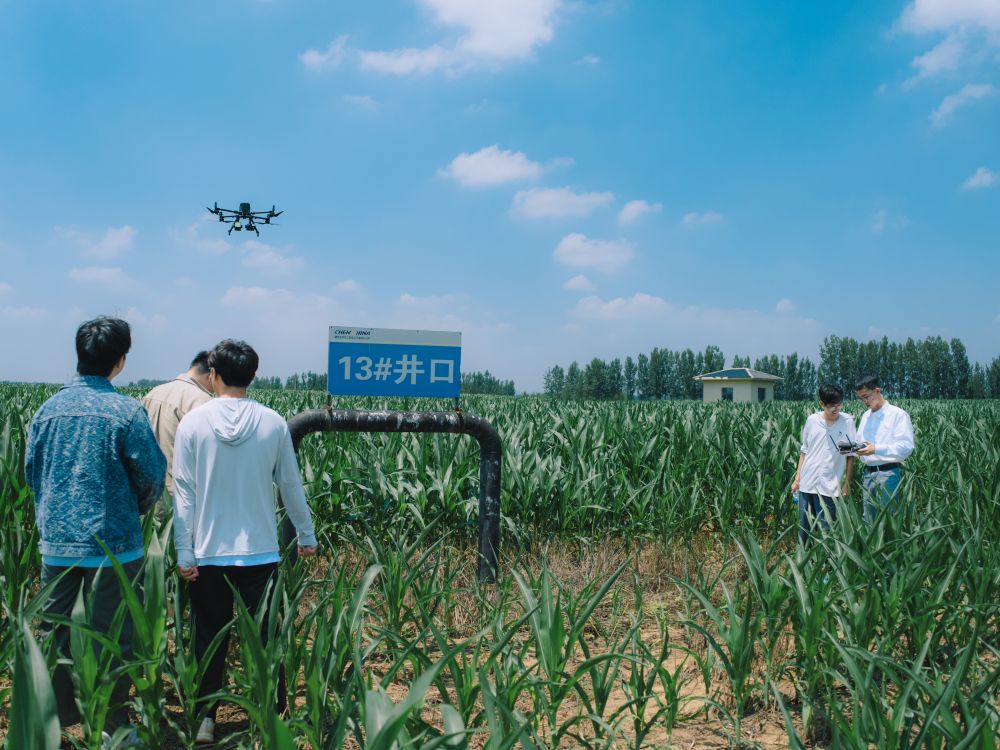 講座結(jié)束后,師生團隊在工廠技術(shù)人員的帶領(lǐng)下,來到鹵水管道經(jīng)過的田地。無人機緩緩升空,沿著預(yù)設(shè)航線對管道沿線進行了低空飛行拍攝。