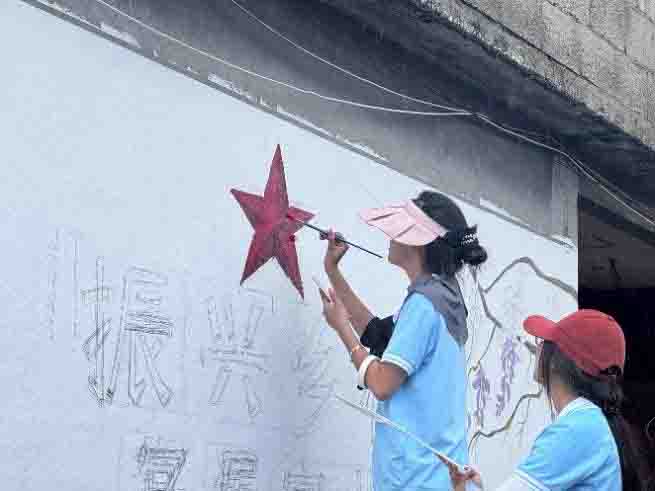 文化振興需要看得見的精神符號。實踐隊聚焦村主干道墻面開展鄉(xiāng)村振興主題墻繪。隊員們分工協(xié)作,將遒勁紫藤枝蔓、串串藤花與紅五星歷史印記相呼應(yīng),搭配 “鄉(xiāng)村振興”等標語,使單調(diào)墻面轉(zhuǎn)化為串聯(lián)歷史記憶與鄉(xiāng)村新貌的 “文化宣傳欄”。村民紛紛駐足觀賞這承載過往與希望的畫面,整個村莊因這抹綴著紫藤花影的獨特色彩,煥發(fā)出跨越時空的生機與活力。