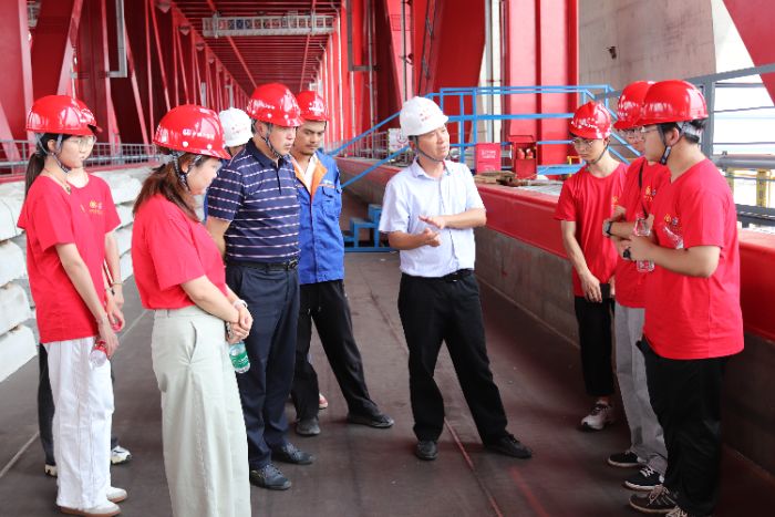 實踐團隊在中鐵大橋局二公司工作人員帶領下前往此行的核心站點——巢馬城際鐵路馬鞍山長江公鐵大橋施工現(xiàn)場。在曹總工程師的全程陪同講解下,團隊成員沿著施工通道到達橋面作業(yè)區(qū),從主塔結構的力學平衡設計,到鋼梁架設的精度控制,再到復雜水文環(huán)境下的基礎穩(wěn)定性保障,每一處細節(jié)都讓課堂上的力學公式與工程實踐實現(xiàn)了“無縫對接”。