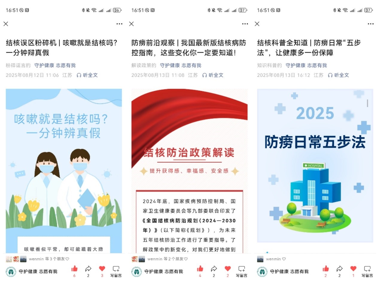 在線下宣講的同時,東大外院結(jié)核防治宣講團線上宣傳也持續(xù)發(fā)力,在團隊公眾號“守護健康 志愿有我”中特設(shè)三大欄目,“結(jié)核科普全知道”系統(tǒng)解讀結(jié)核病病理、傳播途徑與防治要點,從基礎(chǔ)癥狀到治療周期,用通俗語言普及專業(yè)知識;“防澇前沿觀察”結(jié)合國家政策,幫助大家快速理清現(xiàn)有的結(jié)核治療高新技術(shù);“結(jié)核誤區(qū)粉碎機”直擊 “結(jié)核病不治之癥”“傳染性極強無法防范” 等謠言,用權(quán)威數(shù)據(jù)和醫(yī)學(xué)結(jié)論澄清認知偏差。團隊已發(fā)布推文 20 篇,涵蓋政策解讀、謠言破除、知識科普等內(nèi)容,形成一站式健康指南。同時,小紅書、抖音、微博等平臺同步更新團隊日志,記錄宣講實況、成員感悟與防治小知識,用鮮活形式擴大科普覆蓋面。