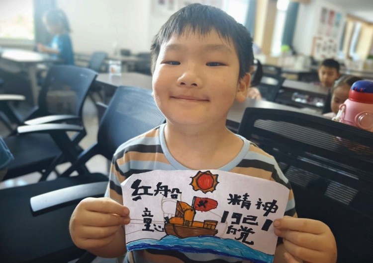 趣味生動的黨史動畫視頻更是吸引了學生們的注意力。老師結合視頻,通過引導、互動、問答的形式向小朋友們講解了黨旗中鐮刀和錘子兩個符號的象征意義,現(xiàn)場氣氛熱烈。之后,小朋友們與助教老師共同合作,畫出了一幅幅精美的紅船,赤色的黨旗隨波浪展顏,鮮艷的船身在碧浪中前行,紅船精神也在新生代中展現(xiàn)新的生命力。