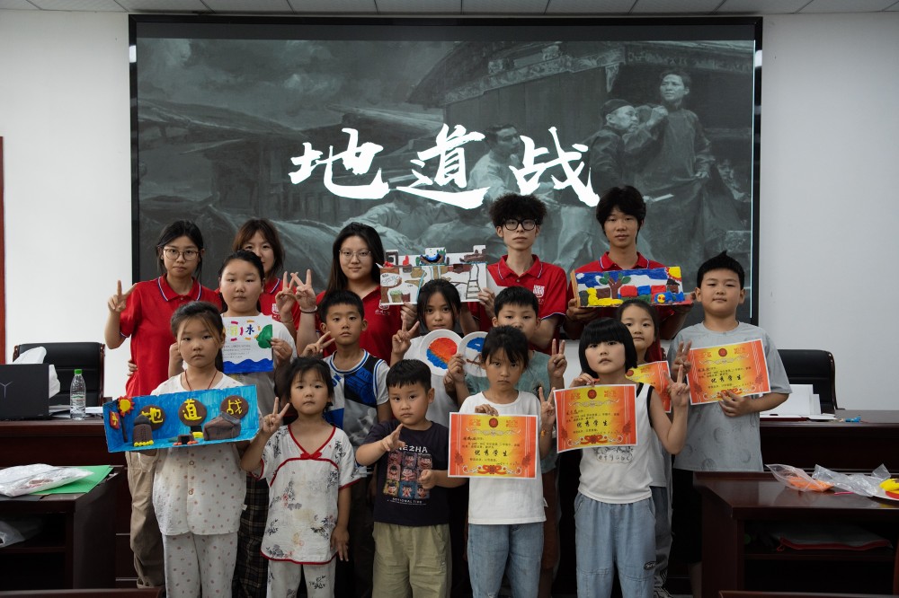 美育創(chuàng)意工坊:廢舊材料變身“地道戰(zhàn)”微景。6月27日下午,實(shí)踐隊(duì)員以“地道戰(zhàn)為主題”,講述了抗日戰(zhàn)爭時(shí)期在華北、冀中平原上抗日軍民利用地道打擊日本侵略者的特殊作戰(zhàn)方式。同樣在手工實(shí)踐環(huán)節(jié),帶領(lǐng)孩子們采用廢物利用的方式,將舊紙箱、舊報(bào)紙、粗糙麻布、天然樹葉、細(xì)碎砂石等豐富多樣的綜合材料,帶領(lǐng)孩子們以廢舊紙盒為創(chuàng)作基底,化身“小小工程兵”,用工具小心挖掘出縱橫交錯(cuò)的“地道”網(wǎng)絡(luò)。他們巧妙運(yùn)用各種材料,揉皺的報(bào)紙塑造起伏地形,麻布與樹葉偽裝洞口,砂礫鋪設(shè)地面增強(qiáng)質(zhì)感。孩子們共同協(xié)作完成了多個(gè)充滿歷史厚重感與戰(zhàn)場臨場感的“地道戰(zhàn)”立體微景模型。沉浸式的創(chuàng)作過程,讓智慧抗戰(zhàn)的精神深深烙印于心。
