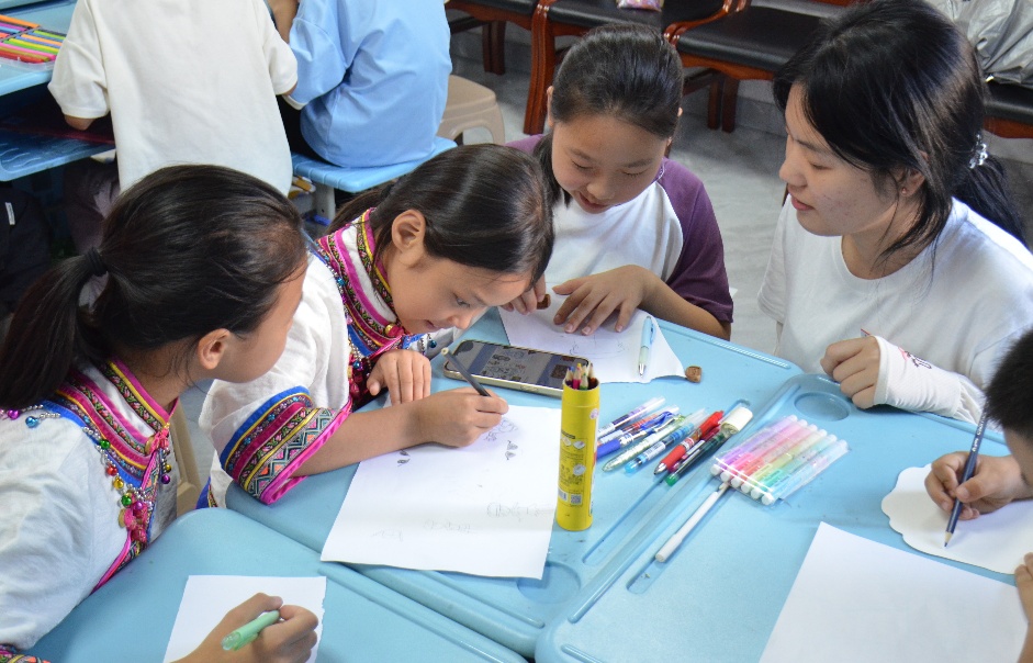 為傳承畬族文化,實(shí)踐隊(duì)開設(shè)專題藝術(shù)課堂。隊(duì)員陳煜彬詳解畬族起源與習(xí)俗,《三月春來》舞蹈視頻里,畬族服飾與靈動舞姿展現(xiàn)的勞作喜悅,讓孩子們不禁隨樂律動。藝?yán)L環(huán)節(jié)中,身著紅黑主調(diào)、黃藍(lán)點(diǎn)綴畬族服飾的孩子們,接過鳳凰圖騰、幾何紋等文創(chuàng)素材,在扇面上勾勒心中的畬族文化 IP,激烈的思路碰撞間,筆觸流淌著對民族文化的深刻體悟。