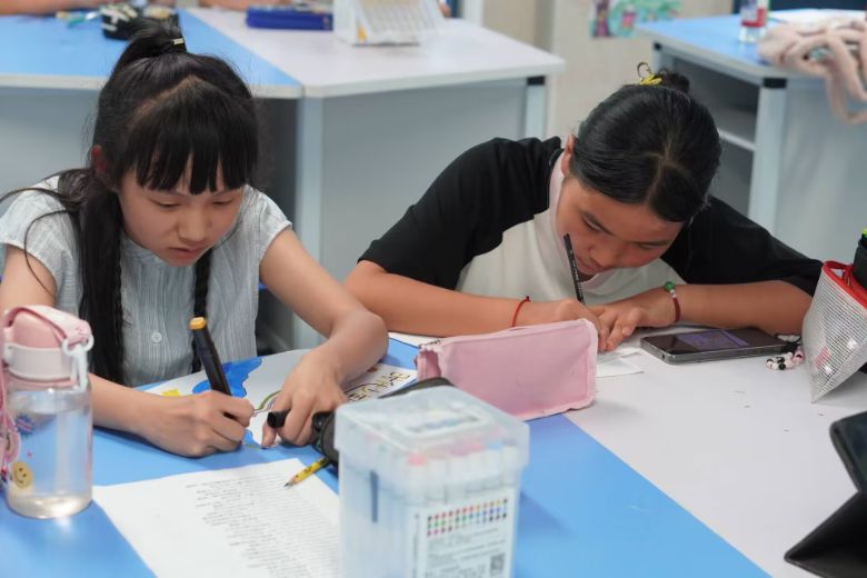 為促進孩子們對知識的運用能力與創(chuàng)造力發(fā)展,激發(fā)其審美意識,7月3日,外國語學院“合語筑夢”鄉(xiāng)村振興團帶領高店鎮(zhèn)中心學校的小朋友們成功開展英文歌曲學唱、創(chuàng)意手抄報、水彩畫等多種特色課程。