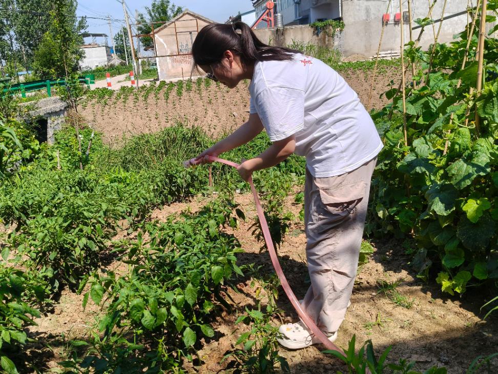 上午10時,驕陽炙烤下的陡張村農(nóng)田,涌動著青春力量。團(tuán)隊成員手持工具,深入蔬菜種植區(qū),開啟助農(nóng)采摘與澆灌工作。團(tuán)隊成員分工明確、配合默契,彎腰勞作的身影與蔥郁的菜田相互映襯,專注投入的神情定格成最美的畫面。盡管驕陽似火,汗水不斷浸濕衣衫,但大家用辛勤的汗水幫助農(nóng)戶緩解勞作壓力,在躬身實(shí)踐中深刻體會到“粒粒皆辛苦”的內(nèi)涵,更讓青春在這片希望的田野上綻放出絢麗的光彩。