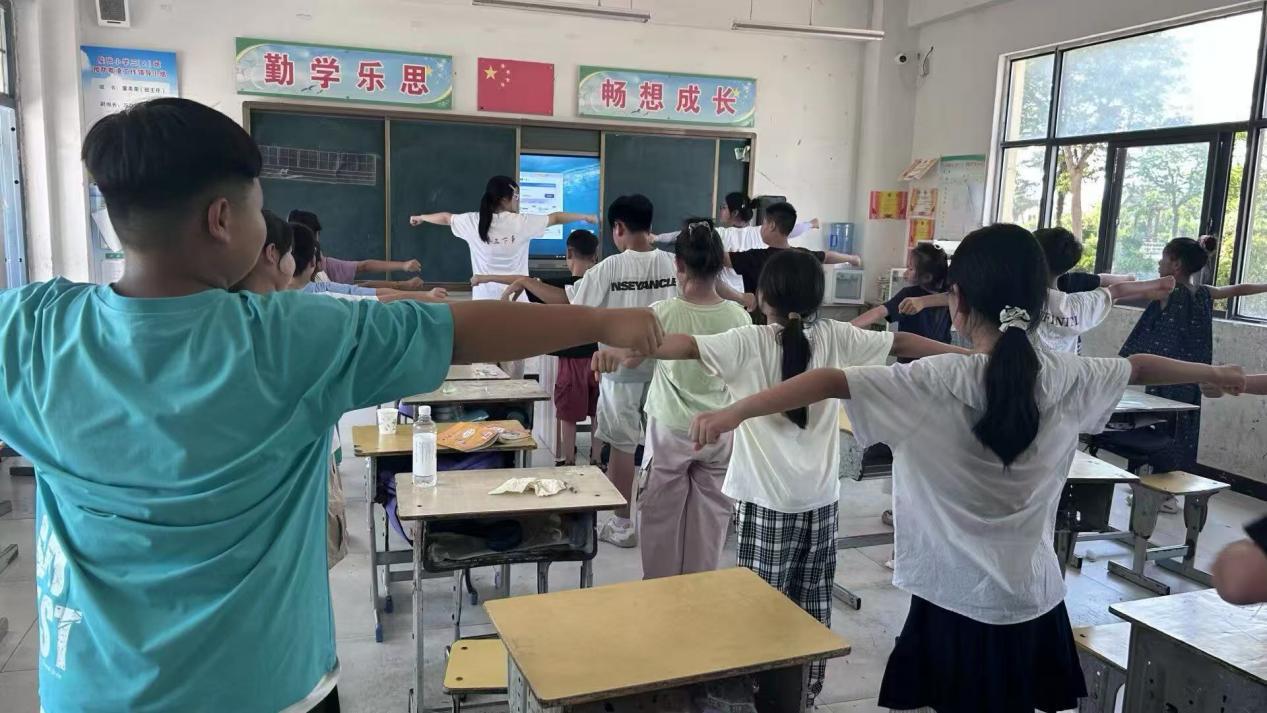 午后 14 時 30 分,充滿活力的趣味互動課堂同步進(jìn)行。團(tuán)隊成員帶領(lǐng)學(xué)生們進(jìn)行互動游戲,整齊劃一的動作、朝氣蓬勃的姿態(tài),展現(xiàn)了昂揚(yáng)的精神風(fēng)貌。孩子們興致勃勃地跟隨模仿,課堂氣氛熱烈歡快。團(tuán)隊成員巧妙將知識融入游戲,引導(dǎo)孩子們在歡樂中學(xué)習(xí)、在互動中成長。