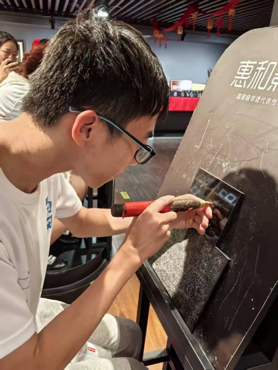 篆鼻尖沉香。紙上得來終覺淺,絕知此事要躬行。隨后,實(shí)踐隊(duì)師生來到羅麗桃評(píng)茶大師工作室體驗(yàn)非遺香篆。以香為墨,借模成形,在勾勒紋樣、燃點(diǎn)沉香的過程里,感受古人雅致的生活智慧,在裊裊青煙中沉淀心緒。實(shí)踐隊(duì)師生清晰地觸摸到傳統(tǒng)文化的溫度,讓浮躁的心在一壓一印間重歸寧?kù)o,收獲了一場(chǎng)身心與歷史交融的治愈之旅。走在非遺傳承的路上,不僅要親身體悟這份“活化石”的美麗,更要傳承它,守護(hù)它。