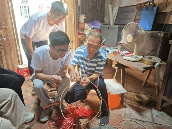 接下來,實(shí)踐隊(duì)來到廈門市集美區(qū)前場(chǎng)陳氏傳統(tǒng)糊紙技藝傳習(xí)中心,與省級(jí)糊紙技藝非遺傳承人陳賜勇先生學(xué)習(xí)了解非遺技藝。每一件紙?jiān)髌范疾粌H僅是手工藝品,更是情感的寄托和文化的傳承,承載著人們對(duì)美好生活的向往和對(duì)祖先、神靈的敬畏之情。陳賜勇老師向我們展示了他熟練的紙?jiān)妓,從削竹片到纏綁帶,可以說是一氣呵成,信手拈來。就在綁框架這一個(gè)小小的步驟上,內(nèi)里大有學(xué)問。不僅要有靈活的手指,更要注意著力點(diǎn),保持竹編的平衡而不能位移。我們廢了九牛二虎之力方才扎好一個(gè)關(guān)節(jié),一轉(zhuǎn)頭師傅已在眨眼間完成。這時(shí)不禁讓人想到:無他,唯手熟爾。“做這些靠的是經(jīng)驗(yàn),現(xiàn)在廈門能做這個(gè)的,不多了。”陳老師說到。實(shí)踐隊(duì)隊(duì)員認(rèn)為紙糊非遺的稀少性與時(shí)代的需求性已成為這項(xiàng)非遺技術(shù)傳承發(fā)展的難題。