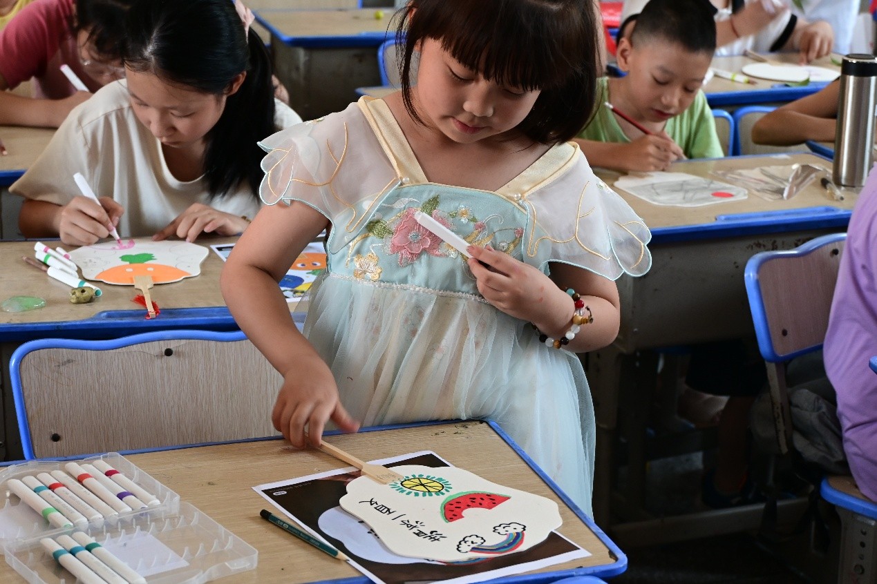 而在美術課堂,孩子們拿起畫筆,在空白扇面上盡情創(chuàng)作。有的勾勒青山綠水,有的描繪可愛動物,還有的繪制心中夢想,五彩斑斕的顏料讓素白的扇子煥發(fā)生機。孩子們舉著自己的作品相互欣賞,笑容中滿是成就感。