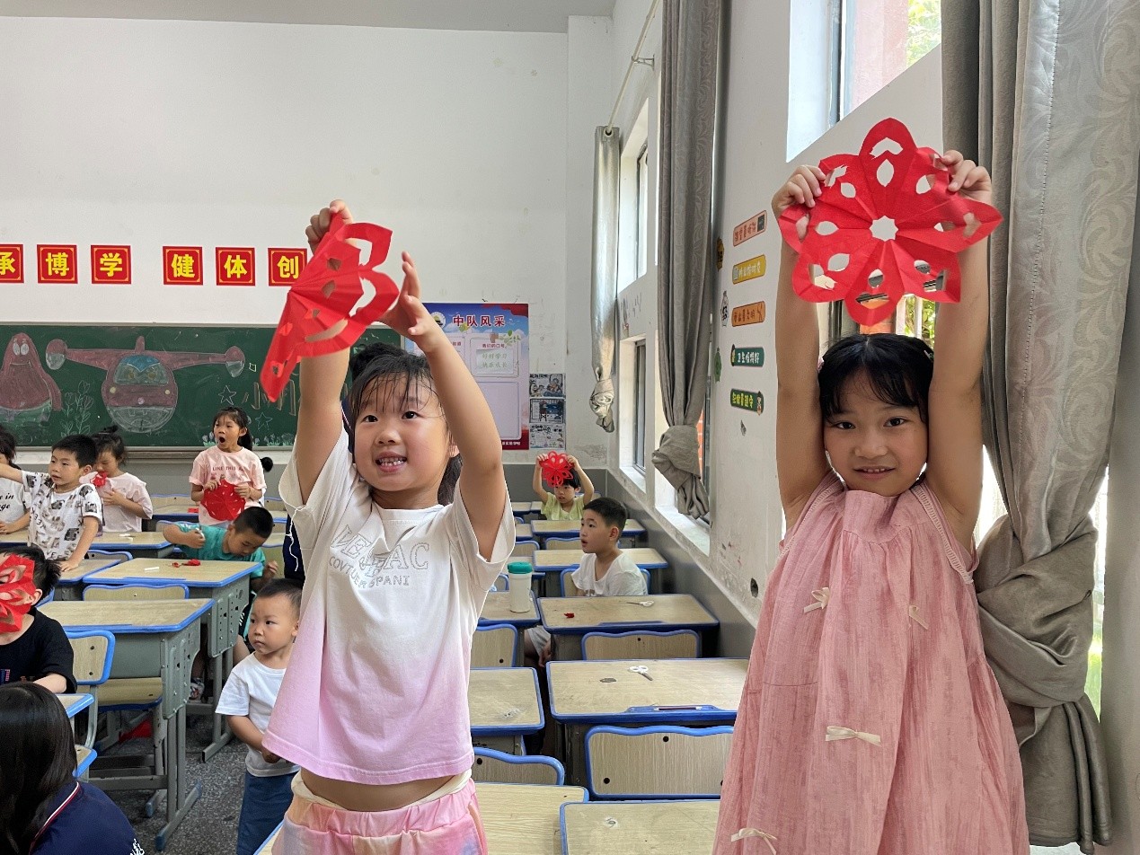 與此同時,音樂教室里歌聲飛揚。老師從發(fā)聲練習入手,教唱勵志歌曲,孩子們跟隨著旋律,用稚嫩的嗓音傳遞歡樂與希望。手工課上,支教老師化身剪紙導師,手把手教授窗花剪裁技巧。紅紙在孩子們指尖翻飛,不一會兒,鏤空的花朵、靈動的蝴蝶等精美窗花作品紛紛呈現。