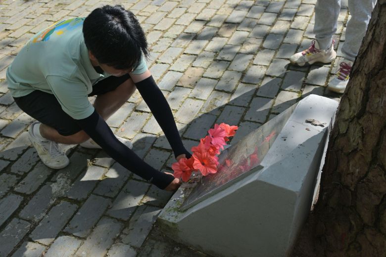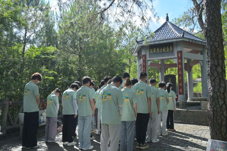 腳踏熱土,追思英魂。一組氣勢恢宏的“十七棵青松”根雕令人震撼,無聲訴說著革命先輩的英勇奉獻。實踐團成員馬恩祈手捧鮮花,懷著崇敬之心,將其莊重地擺放在烈士墓前。全場肅立默哀,這一刻,時空仿佛凝固,我們的心靈穿越歲月,與不朽的英魂對話,感悟那份赤誠與偉大。