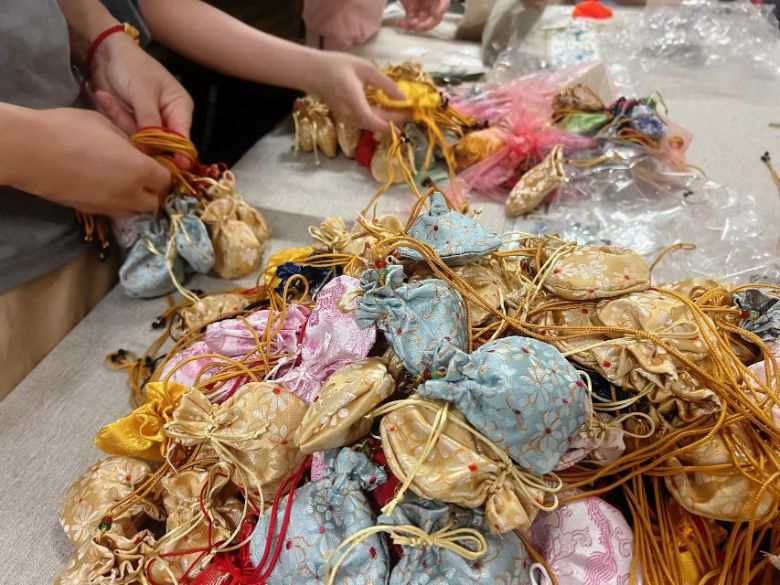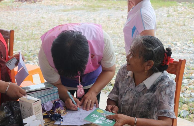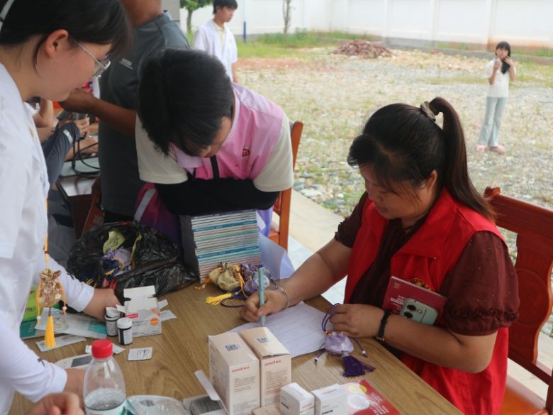 巧手翻飛,情意深長。實踐團成員們精選藿香、艾葉等中藥材,精心縫制兼具預(yù)防感冒、驅(qū)蚊安神功效的養(yǎng)生香囊。一針一線纏繞健康祈愿,百草幽香浸潤仁心厚誼。當(dāng)這份滿載心意的“健康錦囊”送入鄉(xiāng)親手中,傳遞的不僅是關(guān)懷,更是對群眾身心安康的真摯守護。