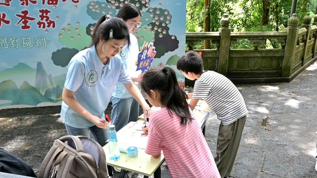 文化長(zhǎng)廊里,“荔”爭(zhēng)上游的巧思化作鄉(xiāng)土課堂。實(shí)踐隊(duì)隊(duì)員化身知識(shí)問答官,以清水巖典故、蓬萊荔枝文化為內(nèi)核設(shè)計(jì)趣味謎題。游客們從簽筒中抽取 “上上簽”,在獲取文化長(zhǎng)廊專屬印章的同時(shí),讓千年巖寺的底蘊(yùn)與荔鄉(xiāng)風(fēng)情隨問答悄然浸潤(rùn)心間。這種寓教于樂的方式,讓游客在欣賞美景的同時(shí),實(shí)現(xiàn)了對(duì)當(dāng)?shù)匚幕纳疃日J(rèn)知。