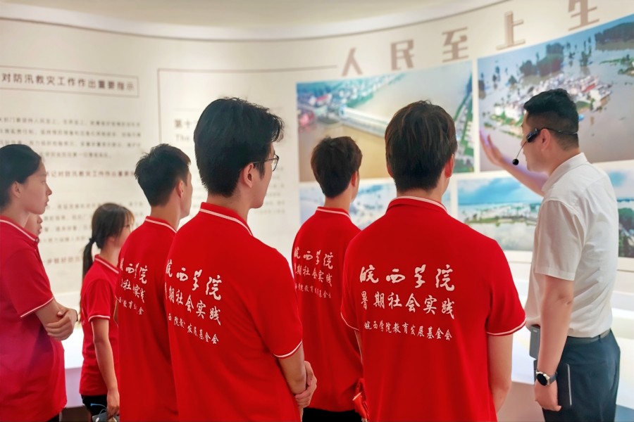 7月1日上午,實踐團首站抵達“千里淮河第一閘”——王家壩閘。隊員們實地考察這一重要防汛工程,重溫習近平總書記關于防汛救災和治淮興水的重要論述,深刻理解其在守護淮河安瀾、保障人民生命財產(chǎn)安全中的核心意義。在王家壩抗洪紀念館的沉浸式學習中,“舍小家、為大家”的精神內(nèi)核深深觸動每位成員。大家真切體會到王家壩人民顧全大局、無私奉獻、堅韌不拔的崇高品格,進一步深化了對“人民至上、生命至上”執(zhí)政理念的理解,F(xiàn)場研討時,成員們一致表示要將王家壩精神內(nèi)化于心、外化于行,以實際行動服務人民群眾。