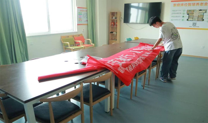 “童心港灣,湘信5E家”的副隊(duì)長(zhǎng)熊君龍和楊播正粘貼開(kāi)課橫幅。紅色的布幔穿過(guò)指尖,“中青社區(qū)青禾樂(lè)園開(kāi)課啦”“溫情支教行夏日撫童心”的字樣在陽(yáng)光下格外鮮亮。汗水順著他們的臉頰滑落,卻擋不住眼里的笑意——這橫幅不僅是儀式,更是一份向孩子們發(fā)出的邀請(qǐng)函:“我們準(zhǔn)備好了,就等你們來(lái)!”