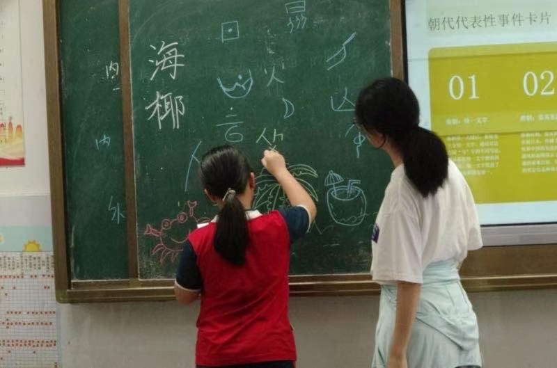 "海南像大菠蘿,廣東是烤雞腿!"在地理課堂上,志愿者劉秦伯用PPT中的"省區(qū)輪廓比喻"點燃孩子們的熱情。通過"云南—孔雀""臺灣—芭蕉葉"等形象比喻,學生們迅速記住各省形狀;迎h(huán)節(jié)"我指你答"中,孩子們爭相搶答:"甘肅是數(shù)字7!""新疆是牛頭!"等等。