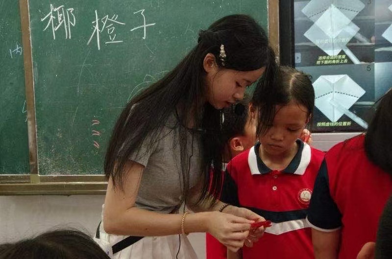 圖為志愿者教學生折紙。葉新宜供圖。