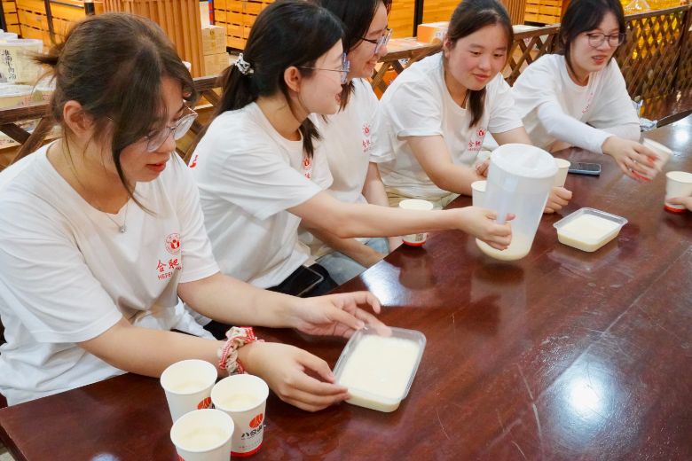 隨后,團(tuán)隊(duì)成員來到豆腐主題文化園。在工作人員的講解下,一場關(guān)于豆腐文化的千年畫卷就此展開。從劉安煉丹誤發(fā)明豆腐的古老傳說,到豆腐制作技藝在歷史長河中的演進(jìn),成員們穿梭于千年時(shí)光,窺見豆腐文化不斷發(fā)揚(yáng)的蛻變。這一過程中,他們不僅聆聽了引人入勝的故事,還目睹了傳統(tǒng)工藝的精妙,更體悟到豆腐在中國文化版圖中的重要性。而當(dāng)他們走進(jìn)互動(dòng)體驗(yàn)區(qū),親手磨豆?jié){、點(diǎn)豆腐,看著白嫩的豆腐漸漸成型,內(nèi)心對(duì)豆腐文化的熱愛也在這一瞬間被點(diǎn)燃。