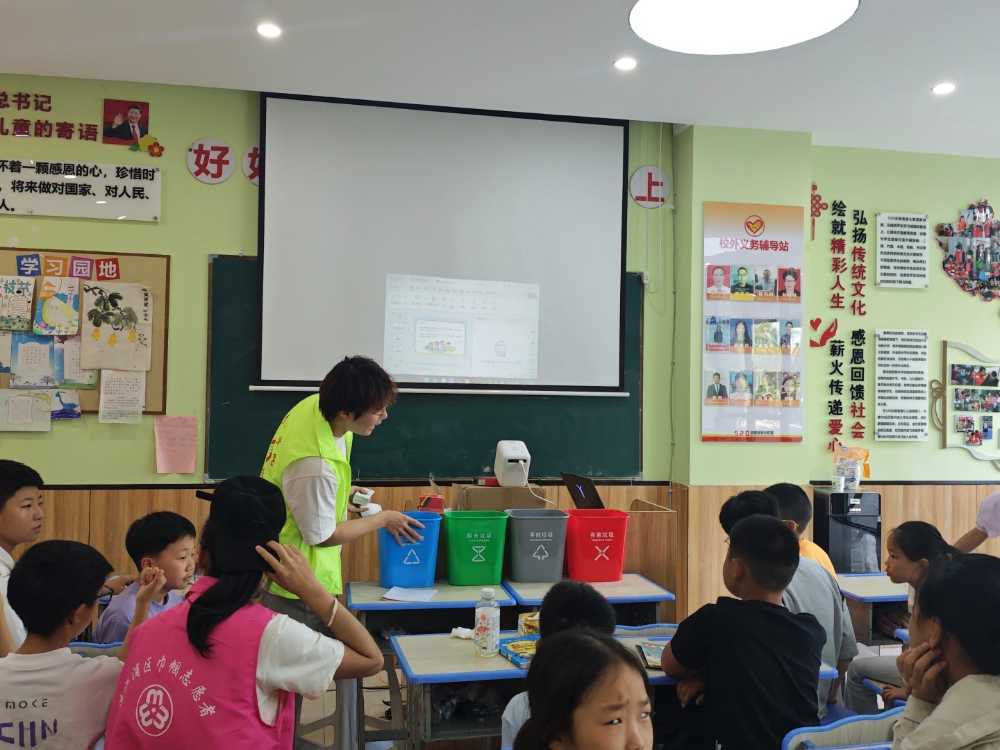 作業(yè)輔導(dǎo)結(jié)束后,以“垃圾分類,從我做起”為主題的文明生活教育活動(dòng)正式啟動(dòng)。團(tuán)隊(duì)成員通過概念講解、圖片展示與視頻教學(xué)等形式,引導(dǎo)學(xué)生系統(tǒng)了解垃圾分類知識,使其掌握正確分類方法并樹立自主的文明意識。為提升學(xué)生參與積極性,團(tuán)隊(duì)設(shè)置了游戲環(huán)節(jié),并以小禮物作為激勵(lì),現(xiàn)場氣氛迅速活躍起來——學(xué)生們踴躍舉手搶答,甚至有小朋友興奮地站在凳子上高舉手臂示意,積極展示所學(xué)文明知識。通過互動(dòng)實(shí)踐,學(xué)生們不僅深化了對環(huán)保文明的理解,更切實(shí)提升了日常生活垃圾分類能力。