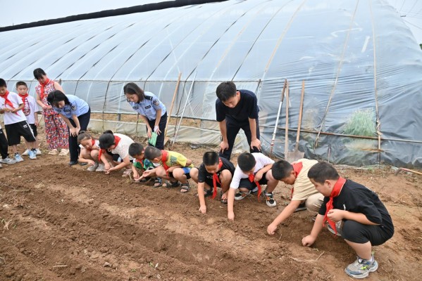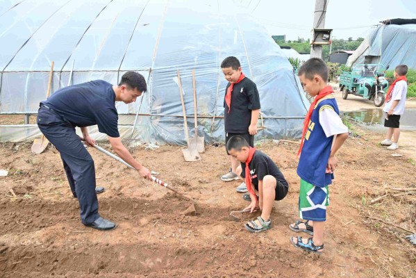 實踐團成員不僅學習農業(yè)技術、參與農事勞作,更以實際行動傳遞責任精神,踐行服務人民的初心使命。從翻土、播種到澆水,實踐團成員頭頂烈日,俯身田間,與村民一同勞作。田間勞動間隙,實踐團成員手把手教會孩子們佩戴紅領巾,使孩子們深刻體會到“粒粒皆辛苦”的不易,上了一堂別開生面的愛國教育實踐課程。