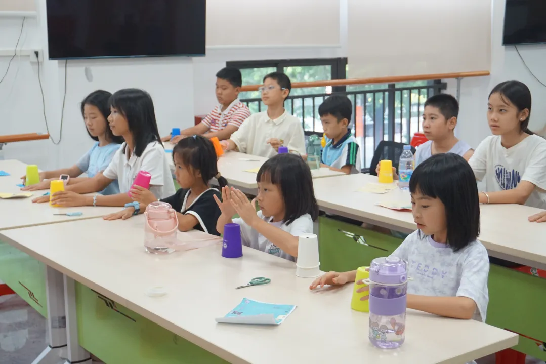 用杯子舞演奏《稻香》片段,向“音樂廣場上的樂手”發(fā)起挑戰(zhàn)的終極任務(wù),將課堂氛圍推向高潮。小朋友們在老師的帶領(lǐng)下,跟隨視頻指示,以杯子為道具,通過敲擊桌面、拍手,配合伴奏完成杯子舞演奏。從零散動作到整齊合奏,杯子碰撞聲與音樂旋律交融,課程也接近尾聲。“你想不想和老師在結(jié)營的時候一起表演這個杯子舞?”“想!”從故事共情到知識學(xué)習(xí),再到實踐演奏,環(huán)環(huán)相扣的設(shè)計讓小朋友們完成了從“音樂旁觀者”到“節(jié)奏演奏者”的轉(zhuǎn)變。
