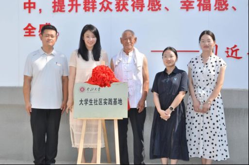 圖為指導老師買璐璐與翼城縣領(lǐng)導為“大學生社區(qū)實踐基地”揭牌(蘭甜馨攝)