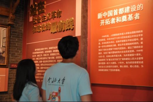 圖為實踐隊員認真查看彭真紀念館中的文字資料(蘭甜馨 攝)