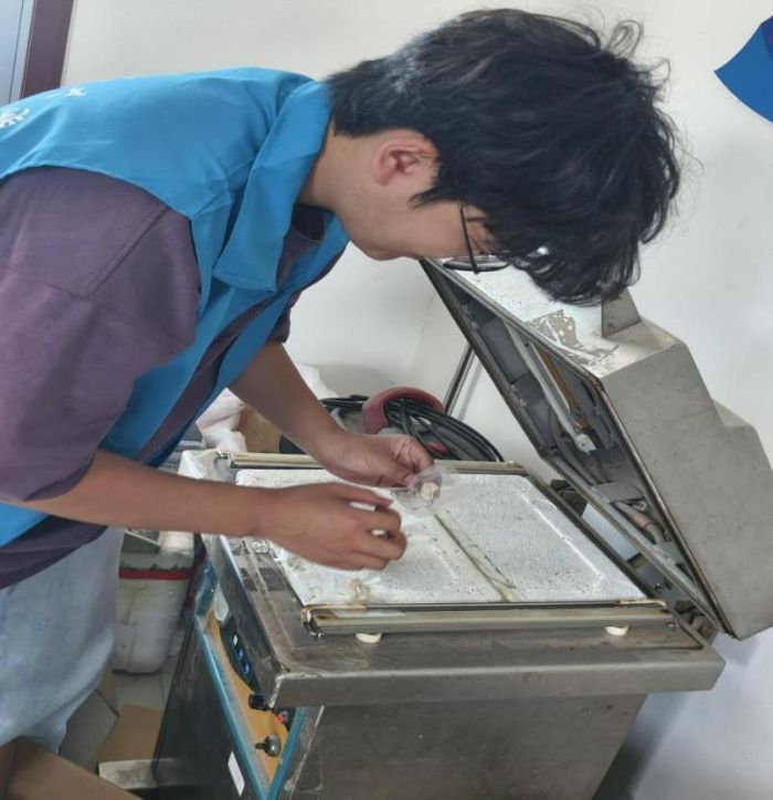 在介紹完爬寵食品的包裝之后,工作人員還向成員們展示了不同類型的運輸包裝容器,并講解了它們的優(yōu)缺點。實踐團成員們親身體驗了凍干的包裝及真空壓縮的過程,了解了運輸包裝的特點以及模式。