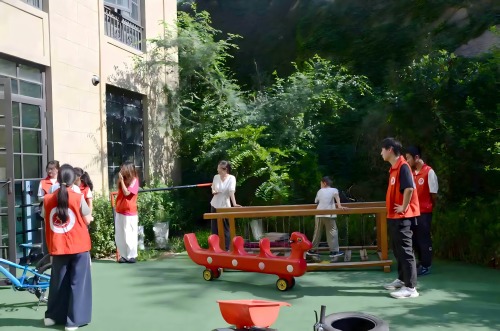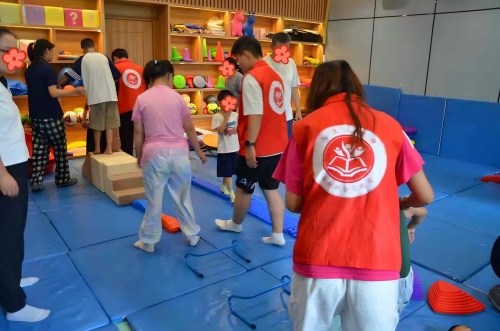 下午,實踐團成員迅速轉換角色,投入到“愛心護航課堂”的沉浸式互動中。課程涵蓋運動技能、精細動作、音樂律動、主題認知、感覺統(tǒng)合及社會性游戲等多領域。在運動訓練環(huán)節(jié),成員們一對一輔助孩子們進行跳躍、行走,盡管動作生澀,孩子們眼中閃爍的光芒和逐漸增強的自信令人動容。音樂律動教室里,成員們坐在孩子身后,協(xié)同老師引導孩子們跟隨節(jié)奏拍手、擊掌、跺腳,歡快的旋律中綻放出張張笑臉,情感與安全感在互動中滋養(yǎng)。主題認知學習中,成員配合老師使用繪本和卡片,耐心引導孩子們認識圖形、水果和文字,原本沉默的孩子也開始嘗試開口表達,合作與認知能力悄然提升。最后的感統(tǒng)訓練室,成員們輕扶孩子們的手臂,協(xié)助他們穿越環(huán)形通道、跳躍障礙、行走窄路,每一次勇敢嘗試都收獲鼓勵的掌聲,有效鍛煉了感官協(xié)調與身體控制能力。