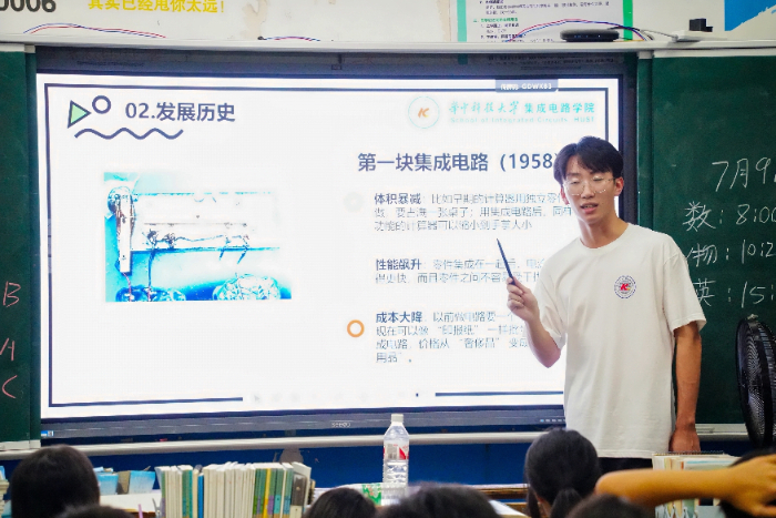 科普課堂上,“龍芯之母”黃令儀為國產(chǎn)芯片事業(yè)鞠躬盡瘁的感人事跡,讓課堂瞬間安靜,孩子們眼中滿是敬佩;華科大英雄校友、時代楷模黃群為保護國家某重點實驗平臺壯烈犧牲的崇高精神,深深觸動了孩子們的家國情懷;集成電路從“沙”到“芯”的神奇旅程、悄然改變生活的人工智能(AI)技術,打開了孩子們望向未來科技的窗口。