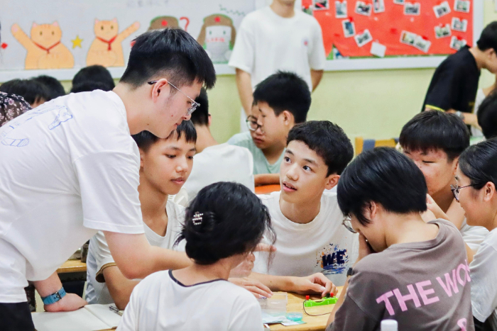 課后,意猶未盡的孩子們將隊員們團團圍住,發(fā)出提問:“學長,集成電路大概包括哪些內(nèi)容呢?”“圖靈測試到底是如何判斷的?”面對這些關于學業(yè)、專業(yè)和未來的好奇,“大哥哥大姐姐”們結(jié)合自身經(jīng)歷耐心解答。