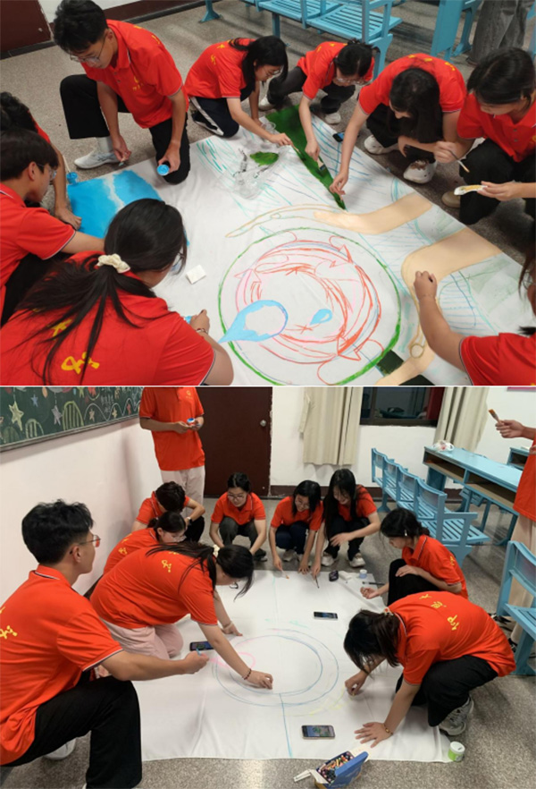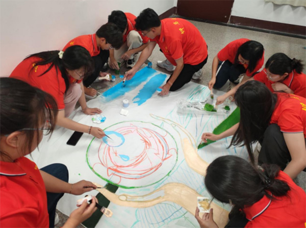 面對(duì)河長(zhǎng)制深化推進(jìn)中“宣傳可視化”的現(xiàn)實(shí)需求,實(shí)踐隊(duì)以“雙手托舉水滴的生態(tài)球”象征護(hù)水初心,下方的河流田園暈染出“河暢景美”的生態(tài)長(zhǎng)卷。活動(dòng)中,實(shí)踐隊(duì)員分工協(xié)作,完成輪廓勾勒、顏料調(diào)試與紋理繪制。通過(guò)呈現(xiàn)生態(tài)球、雙手托舉和河流等元素,直觀地向當(dāng)?shù)鼐用駛鬟f護(hù)水理念,使素樸畫(huà)布變成生態(tài)宣傳載體,呼吁大家關(guān)注河流治理問(wèn)題,推進(jìn)生態(tài)文明建設(shè)。實(shí)踐隊(duì)將創(chuàng)作好的畫(huà)布懸掛在墻體之上,以此喚醒居民護(hù)水意識(shí),推動(dòng)河長(zhǎng)制理念融入居民日常。