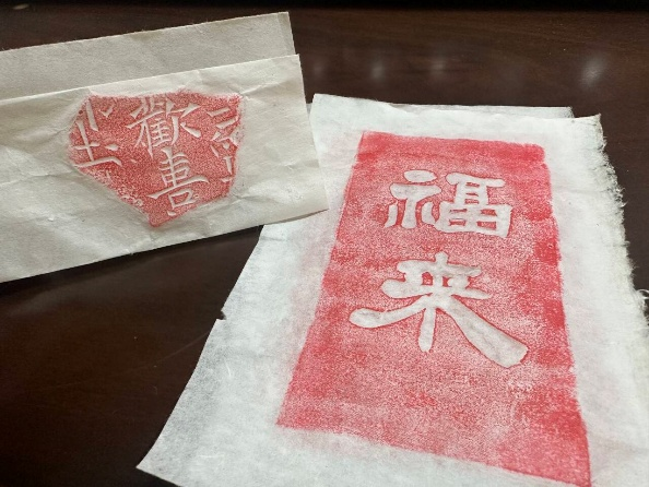姜老師現(xiàn)場演示拓印操作:從宣紙的裁剪與浸潤、與紋樣的貼合技巧,到拓包的蘸墨力度、按壓角度等細節(jié),均逐一示范并講解要領(lǐng)。在體驗環(huán)節(jié),同學(xué)們分組進行實踐,姜老師巡回指導(dǎo),針對宣紙起皺、墨色不均等問題及時糾正,幫助大家掌握“輕掃鋪紙、勻力拓印”的關(guān)鍵技巧。