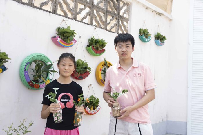 “舊物新生”主題。實(shí)踐隊(duì)與鎮(zhèn)江市黃墟小學(xué)的10名學(xué)生開展活動(dòng)。隊(duì)員們提前準(zhǔn)備了玻璃瓶、廢舊輪胎、顏料、扭扭棒等材料,引導(dǎo)孩子們發(fā)揮想象:有的在瓶身繪制鄉(xiāng)村風(fēng)光,有的則在輪胎上畫出動(dòng)植物,甚至把心里的童話世界都畫出來!經(jīng)過一個(gè)半小時(shí)創(chuàng)作,原本閑置的玻璃瓶變成了色彩斑斕的“花瓶”,插上扭扭棒花朵后,更顯童趣與創(chuàng)意。