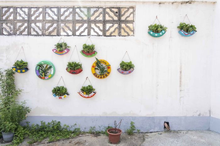 輪胎經(jīng)彩繪,被懸掛在農(nóng)戶院墻上,成為花盆,為村容村貌增添了藝術(shù)氣息。原本廢棄的輪胎,現(xiàn)在成了家門口的“風(fēng)景線”。