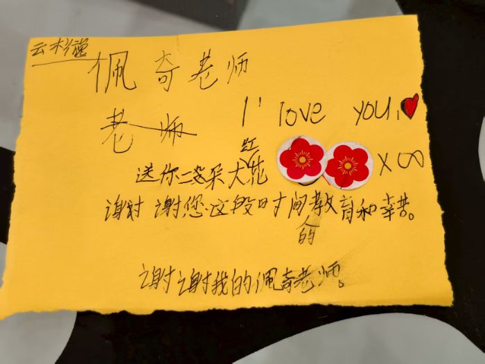 而愛,終有回響。暑托班臨近尾聲,孩子們伏在桌前,認真書寫起給志愿者老師們的感謝信。稚嫩的筆跡、真誠的句子,還有畫紙上的小紅花、星星和笑臉,都是這個夏天最動人的禮物。“老師,您辛苦了”“我會想你的”“老師我愛你”……紙短情長,訴不盡的是依賴與感激。