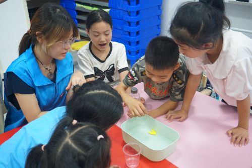 志愿者借硬幣實驗和紙船實驗向小朋友們科普水的表面張力的科學原理;顒咏Y束時,志愿者們分發(fā)“科學探索手冊”,鼓勵孩子們在家繼續(xù)嘗試實驗。