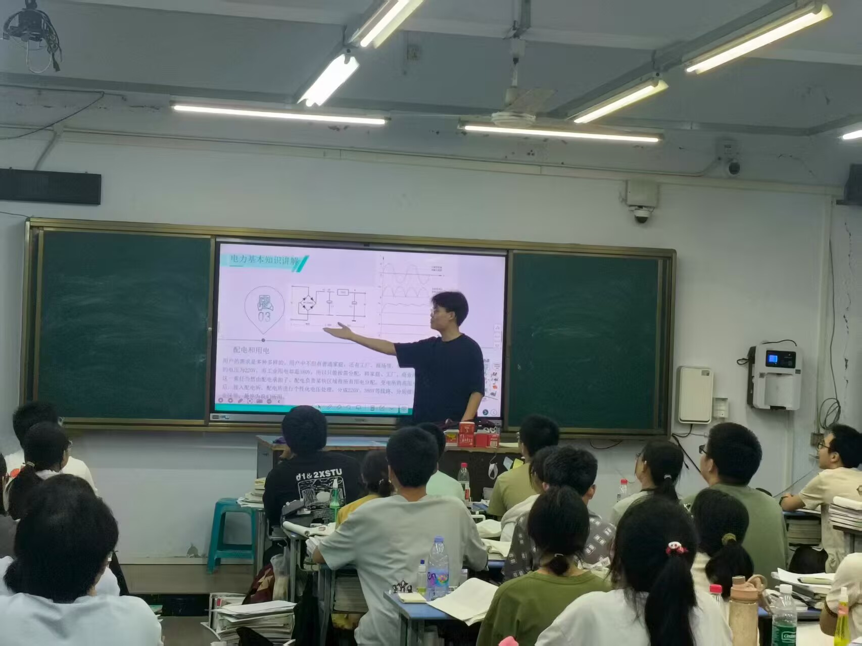活動伊始,陳飛洋以夏季安全用電知識為切入點,結(jié)合生活實例生動講解了電器使用規(guī)范、電路故障排查等實用內(nèi)容。"空調(diào)長時間運轉(zhuǎn)要注意通風(fēng)""發(fā)現(xiàn)電線老化要及時更換"等實用建議讓同學(xué)們頻頻點頭。講解過程中,同學(xué)們神情專注,不時記錄要點,展現(xiàn)出濃厚的學(xué)習(xí)興趣。
