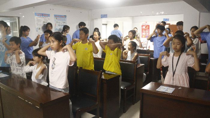 圖為實(shí)踐隊(duì)員帶領(lǐng)小朋友們搭肩熱身,為暑期安全課堂蓄滿生命律動(dòng)的能量。 攝影 康建勇