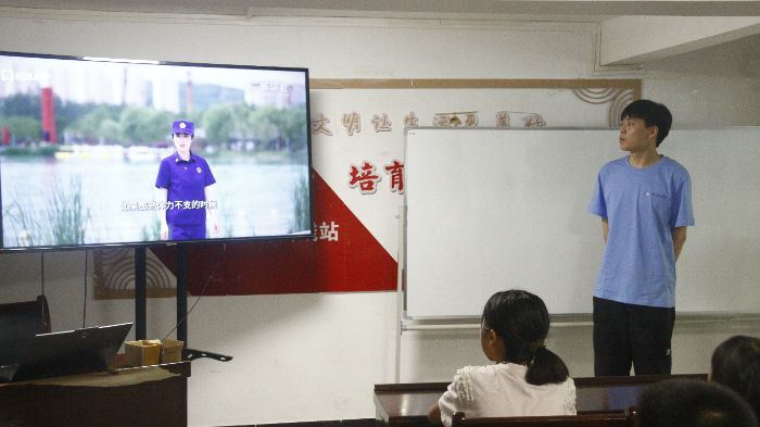 圖為實(shí)踐隊(duì)員帶領(lǐng)小朋友們?cè)诜滥缢n堂觀看大屏宣傳片。 攝影 康建勇