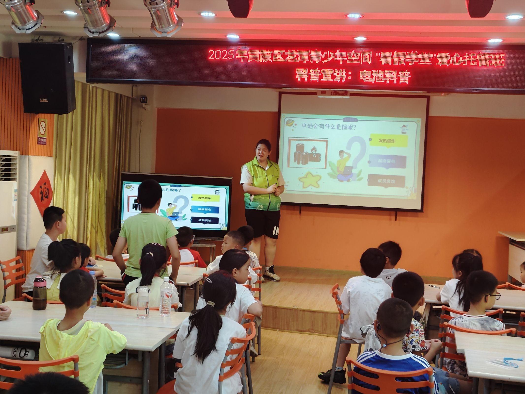 7月10日上午,實踐隊抵達黃陂區(qū)社區(qū)活動中心后,宣講環(huán)節(jié)由兩名隊員主導(dǎo),其余隊員在旁輔助配合。主講隊員以“電池的秘密”為主題,結(jié)合實物展示生動講解不同電池的特點和用途,從家用遙控器里的干電池到新能源汽車上的動力電池,用生活中的例子幫助孩子們理解。講解到廢電池危害時,隊員們通過“土壤污染對比圖”“小動物生存環(huán)境”等案例,讓孩子們直觀感受隨意丟棄電池的危害。過程中,輔助隊員適時舉起對應(yīng)電池實物配合展示,還不時用眼神和手勢與主講隊員互動,提示調(diào)整節(jié)奏,確保孩子們聽得懂、感興趣。