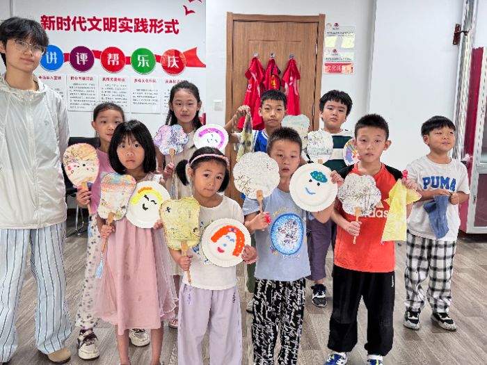 體驗扎染文化的那天,隊員們先向孩子們講解了扎染的歷史淵源和所需工具,隨后指導大家嘗試折疊扎、螺旋扎等基礎(chǔ)技法。孩子們親手完成面料染色、拆結(jié)、沖洗等步驟,當那些獨一無二的扎染方巾被晾曬在陽光下時,他們眼中洋溢著滿滿的成就感。情緒臉譜制作課上,超輕粘土在孩子們的指尖靈動變幻,“開心”的眉眼、“驚訝”的表情、“委屈”的神態(tài)躍然呈現(xiàn)。用亮片點綴出的“激動”、用細線勾勒出的“淚痕”,讓抽象的情緒有了鮮活的具象表達。而故事分享環(huán)節(jié),更讓孩子們的心聲在交流中緊緊相連。漆扇制作進階課程里,素凈的木扇在孩子們的巧手下煥發(fā)光彩。經(jīng)過淺色漆料打底、細筆勾勒,山水、花卉、幾何紋樣逐漸顯露出雛形,傳統(tǒng)工藝與孩童創(chuàng)意在扇面巧妙碰撞,綻放出別樣的美感。