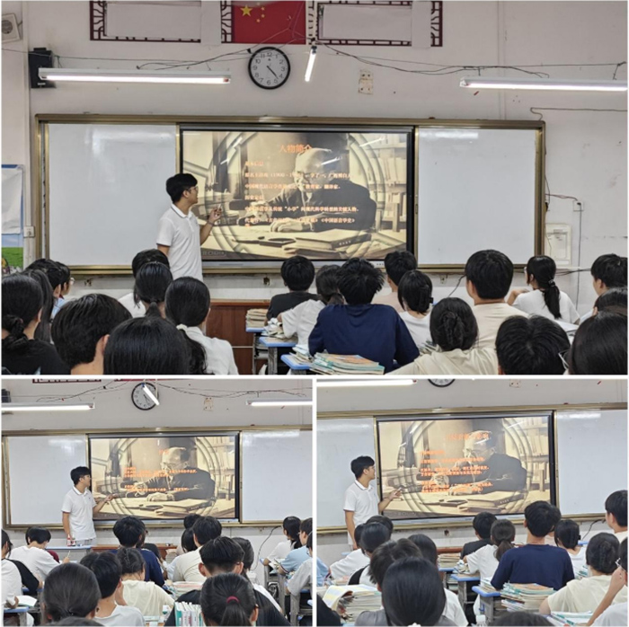 。▓D為團(tuán)隊(duì)成員為亞山一中的同學(xué)們講述王力先生的精神)