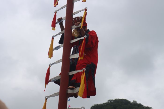 圖為巴代師傅上刀梯(麻麗陽(yáng)攝)