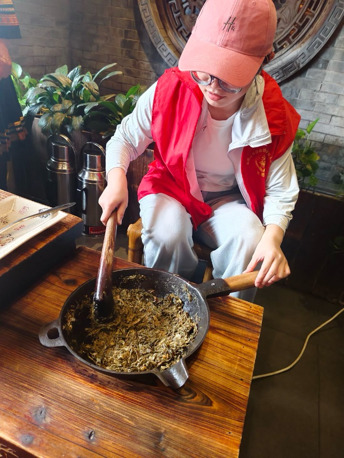 實(shí)踐團(tuán)第二戰(zhàn)來到恭城瑤族自治縣民族產(chǎn)業(yè)展示中心,與非遺恭城油茶縣級(jí)傳承人劉老師深入交流。“恭城油茶”不僅是自治區(qū)級(jí)非物質(zhì)文化遺產(chǎn),更是瑤族人民日常生活的必備飲品。在交流過程中,非遺恭城油茶縣級(jí)傳承人劉老師說到:“恭城油茶起源于唐代瑤族先民應(yīng)對(duì)潮濕瘴氣的生存智慧,至今已有千年歷史。恭城油茶是恭城的文化名片,我希望通過大家的努力,讓這張名片更加亮麗,讓油茶文化走向全國(guó),走向世界。同時(shí),我也希望更多的年輕人能夠加入到油茶文化傳承的隊(duì)伍中來,讓這技藝在新時(shí)代煥發(fā)出新的生機(jī)與活力。”傳承人向成員們?cè)敿?xì)演示了油茶制作的六道核心工序:從最初的用開水浸泡茶葉5-10分鐘,到洗凈茶葉;從燒熱茶鍋放入少許食油,到放入茶葉、生姜、蒜米并反復(fù)捶打;最后加入開水和精鹽,整套流程一氣呵成,力道與火候的把握盡顯功力。實(shí)踐團(tuán)成員們沒有止步于觀摩。在傳承人的指導(dǎo)下,實(shí)踐團(tuán)成員們親手嘗試捶打技巧,成員們親自體驗(yàn)了炒茶、捶打、過濾等工序,深刻感受到了恭城油茶"一杯苦、二杯呷(澀)、三杯四杯好油茶"的獨(dú)特風(fēng)味和文化內(nèi)涵。