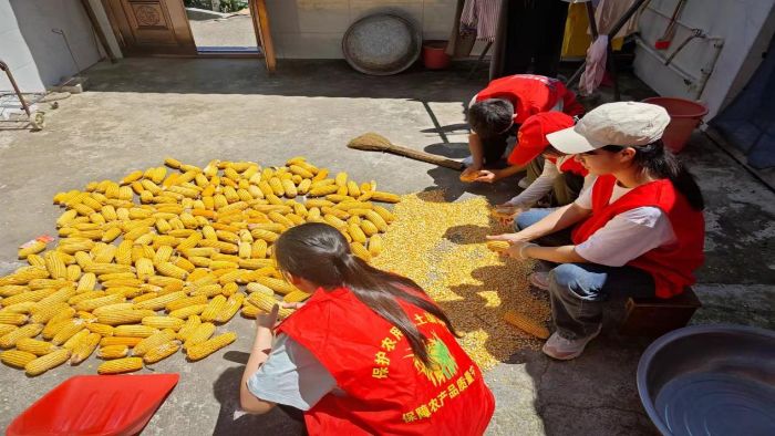 實(shí)踐隊(duì)隊(duì)員們還熱心幫助村民們晾曬玉米和稻谷。隊(duì)員們汗水浸濕了衣衫,以實(shí)際行動(dòng)樹立了勞動(dòng)意識(shí)和價(jià)值觀,減輕了農(nóng)戶的負(fù)擔(dān),傳遞了愛(ài)心與溫暖,展現(xiàn)了鄉(xiāng)村團(tuán)結(jié)互助的精神風(fēng)貌。