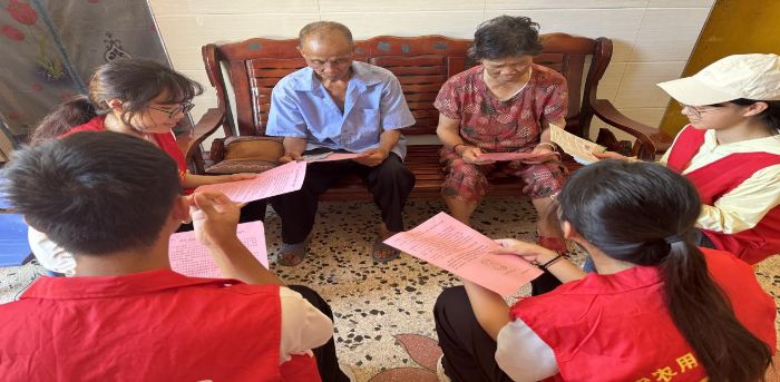 (圖為實(shí)踐隊(duì)協(xié)助村委一起走訪調(diào)查村民情況,并宣傳國(guó)家政策,攝影:溫紫璇)